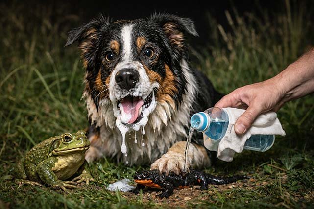 Kutya habzó szájjal béka vagy gőte megnyalása után, gazdi vízzel öblíti a száját